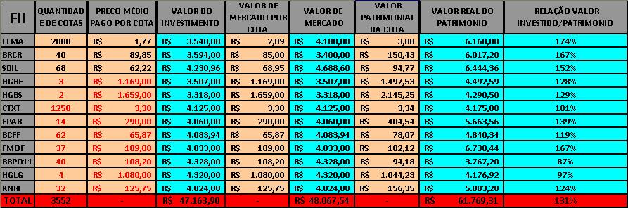 Pretendo chegar ao fim de 2016 com um investimento total em FIIs de R$ 48.000,00, alocados em 10 ou 12 fundos com peso igual entre eles +- 10% cada ou R$ 4.000,00.